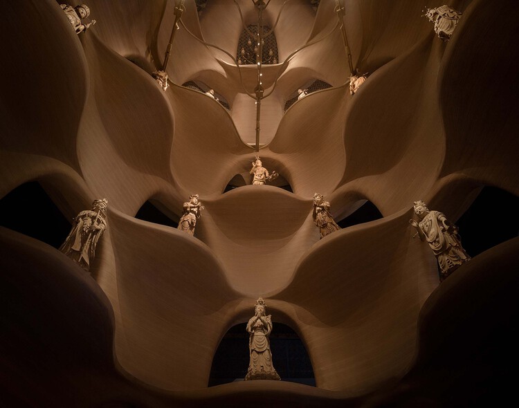 用于集中展陈木佛像的主殿是一座框架结构的仿宋式建筑,大殿面宽30米,进深16.8米,殿内设有两层环廊及楼梯,围合出中部挑空高度近20米的高大空间。如何结合不同尺度的木佛造像营造多层次的展陈体验,并能够适配旧有佛殿有限的空间,创造可观、可游的当代精神性场所,是本次设计考虑的首要问题。设计借鉴了“塔”这一建筑原型,在大殿中创造了一座空心佛塔,作为立体展陈木佛造像的主要载体。