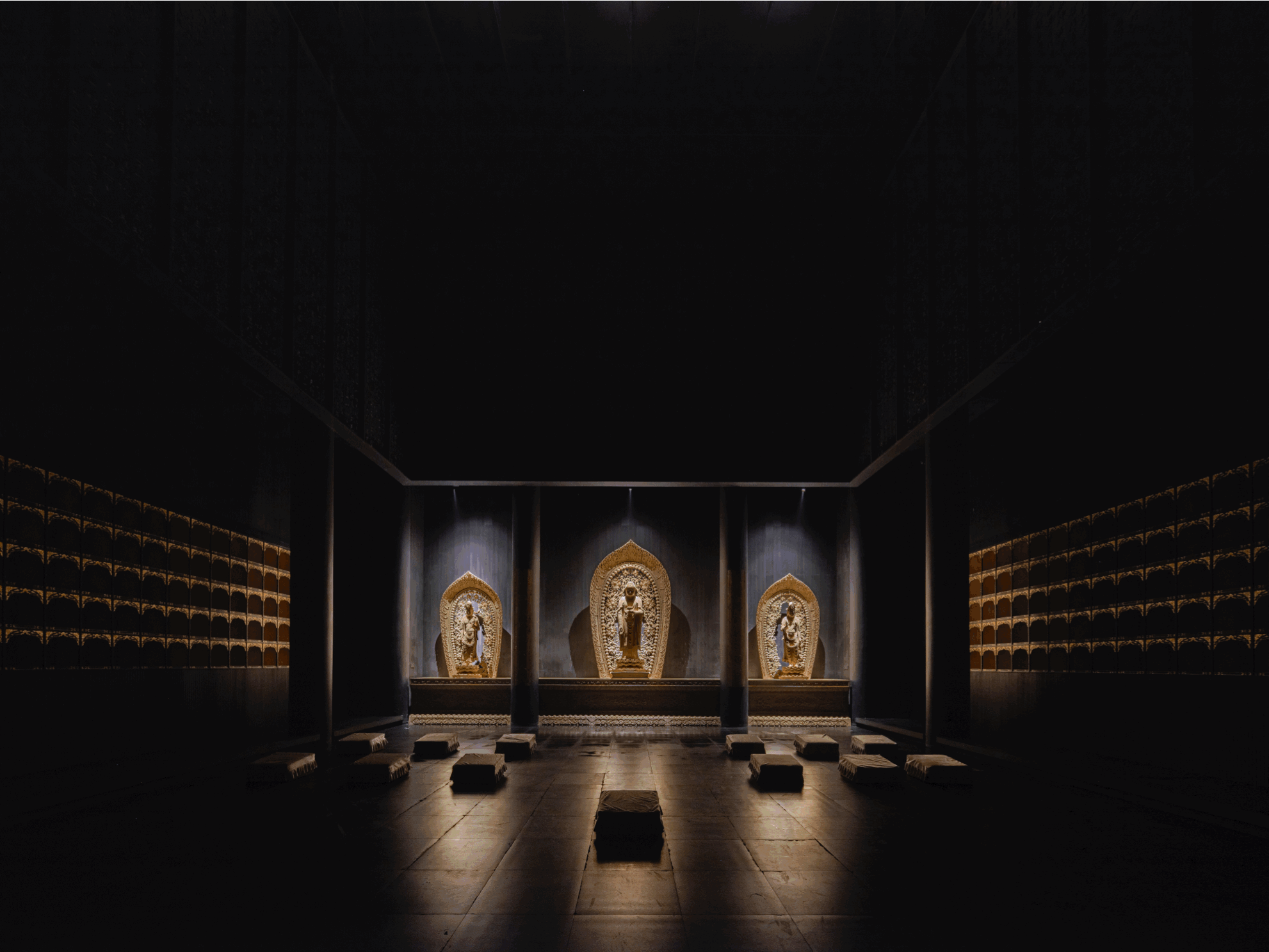 博物馆两侧的耳殿被定义为讲经堂,是博物馆公共教育活动的重要补充。设计利用了耳殿建筑近 11 米的高度特点,在靠近天花的位置悬置四面发光经文金属板,并利用镜面反射材料进一步拔高了空间,营造出亦真亦幻、颇具未来感的艺术空间氛围。四周墙体均为暗色吸音板,为讲经堂营造了良好的光学与声学环境,补足了博物馆的功能和精神属性。