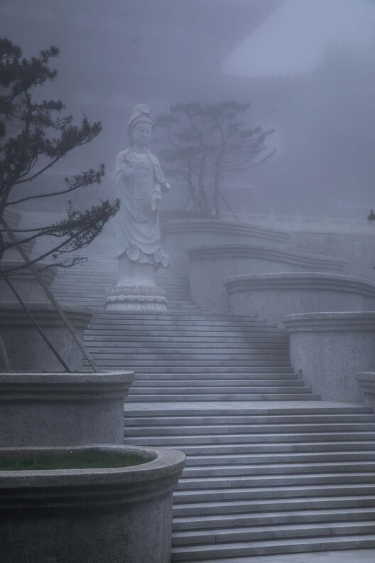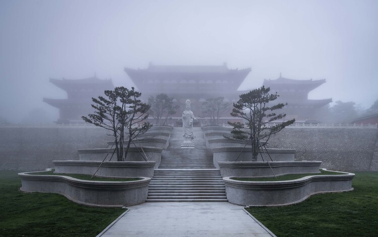 新的设计在延续寺庙中轴线以及保留观音石雕立像的前提下,对现有前区景观进行改造提升。为了加强进入博物馆的仪式感,前区景观被设定为“云台”,结合场地的高差条件,围绕中心台阶展开高度不一的七层水洗石阶梯平台。设计同时扩大了观音立像所在的休息平台,并将台阶的坡度适当放缓,以便于人的行走与停留。云台以柔美的曲线形态宛如祖山云雾逐层漫延开来,平台之上附有喷雾设施、草坪以及点景松树。当游客穿过不断变幻的水雾之云拾级而上,心情也逐渐平静下来,三座大殿才慢慢显露其真身。