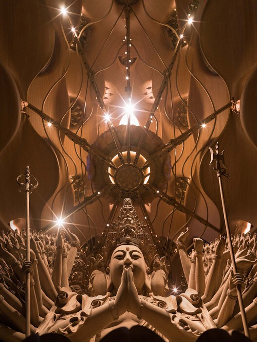 佛塔首层以6米高的四面千手观音的坐像为中心,周边错叠环绕30尊观音化身立像。结合佛像的尺度和位置设置了特定的佛龛——拱洞开口,以及由塔身延伸出的花瓣形底座来承托木佛。