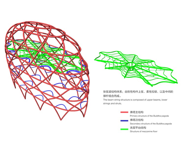 佛塔平面呈椭圆形,共七层,逐层向上收束,汇聚于矩形的佛殿空间顶端。佛塔内部以曼陀罗作为意向。曼陀罗意为坛场,即一切圣贤、功德的聚集之所,代表了佛教文化的宇宙模型。