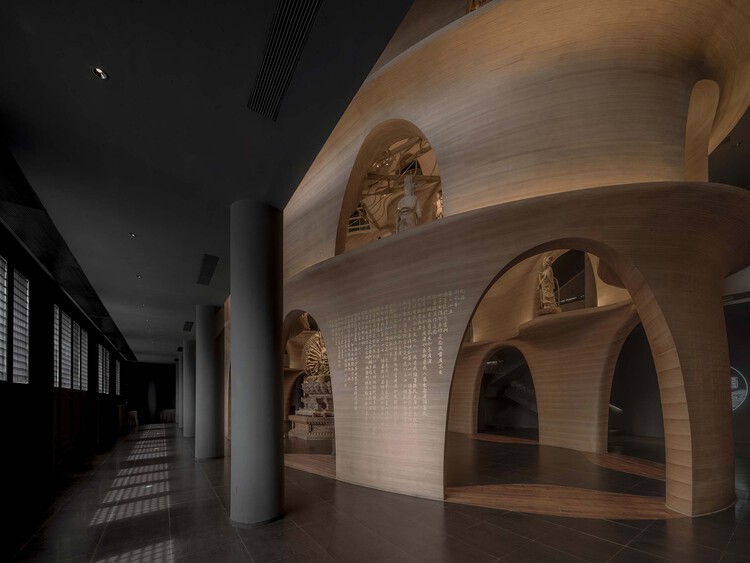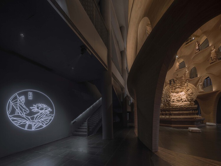博物馆设计融合了室内、展陈、雕塑、影像、景观等多种艺术门类进行综合呈现。从曼陀罗、浮屠等宗教意向出发,以当代全新的方式诠释了佛文化艺术的精神魅力,让人们沉浸其中,游历、静思、冥想,回顾自己的内心世界。