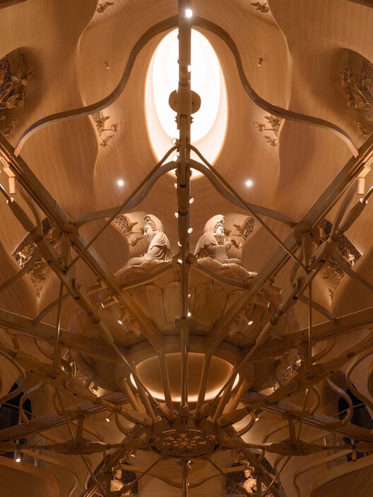 佛塔在五至七层集中展示圣观音造像。第五层中心位置为两尊圣观音的坐像。为了突出中心感和悬空感,设计采用张弦梁结构,并辅以莲花座等装饰杆件,在塔身内部形成一层涟漪扩散的景观。最小的圣观音像被置于第六、七层,匹配制作了枝叶般的金属支架展陈。塔的顶端结束于层层退晕的光线。至此,当游人于塔内驻足观赏,如花瓣般的佛座层层汇集于顶端的一处光明,万象森列、圆融有序,构建出崇高、无尽、深远的禅境。