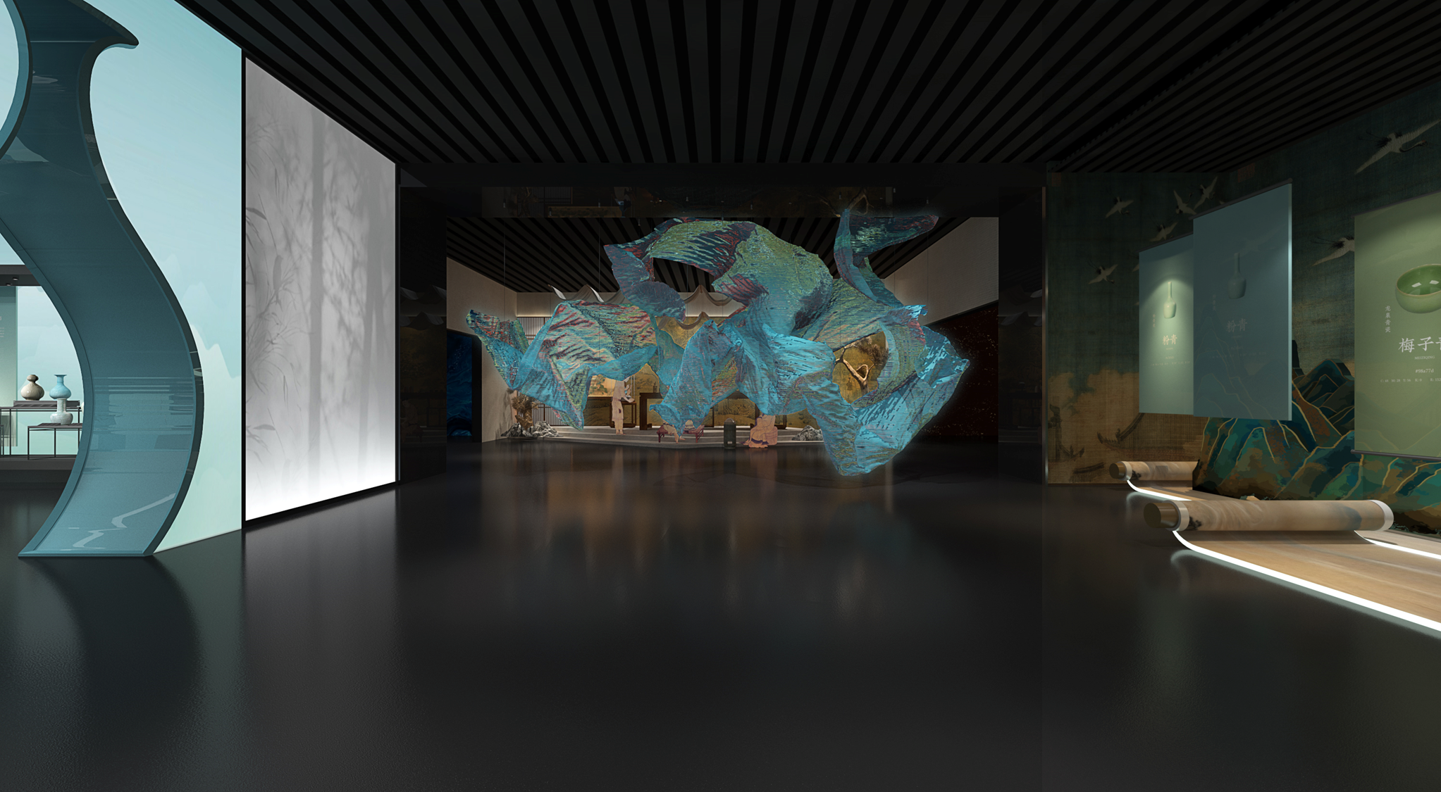 踏入展区,仿若踏入梦幻之境。借助艺术纱幕、灵动光影与特效音效的绝妙组合,“徽宗之梦・雨过天青”徐徐展开,瞬间将参观者裹挟进宋徽宗笔下 “雨过天青云破处” 的诗意天地,仿若亲身漫步于那如梦如幻的天青梦境。